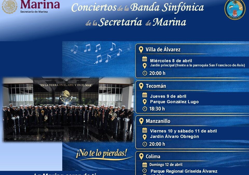 Manzanillo, Col.- La Secretaría de Marina-Armada de México, por conducto de la Sexta Región Naval, invita a la población en general a las presentaciones que dará la Banda Sinfónica de la Secretaría de Marina en el estado de Colima, del 8 al 12 de abril de 2026, con el fin de difundir la cultura naval.