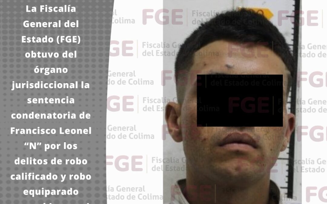 La Fiscalía General del Estado (FGE) obtuvo del órgano jurisdiccional la sentencia condenatoria de Francisco Leonel “N” por los delitos de robo calificado y robo equiparado cometidos en el municipio de Manzanillo.