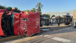 Una de las unidades quedó atravesada en el sentido Colima–Manzanillo, mientras que el otro tráiler se encuentra en dirección opuesta; además, la camioneta tipo SUV chocó y quedó a un costado.