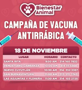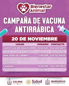 Durante el periodo del 18 de noviembre al 3 de diciembre, el personal de Bienestar Animal recorrerá diversas comunidades y colonias de Manzanillo. Para registrarse, las familias deberán comunicarse al número de contacto asignado a su localidad.