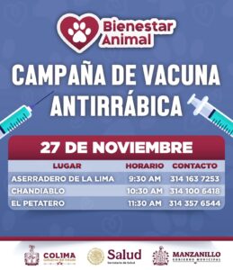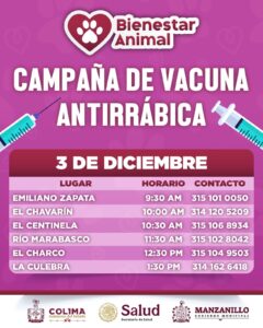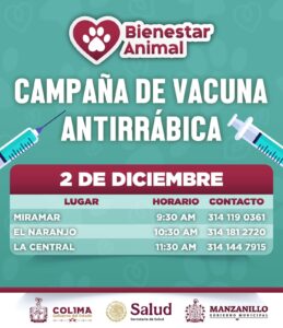 El Gobierno de Manzanillo, encabezado por la presidenta Rosi Bayardo, iniciará una campaña de vacunación antirrábica gratuita para perros y gatos, con el objetivo de prevenir la rabia y acercar este servicio a las comunidades del municipio.