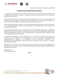 A través de un comunicado la Administración del Sistema Portuario Nacional Manzanillo (ASIPONA) actualizó la situación sobre el incidente ocurrido este lunes enla terminal de Hutchison Ports TIMSA: