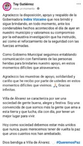 La presidenta municipal de Vialla de Álvarez, Esther Gutiérrez Andrade, posteó en su red social de Facebook su agradecimiento al respaldo y apoyo que la gobernadora Indira Vizcaíno Silva le ha extendido con respecto a la situación que ha permeado tras el ataque armado que se dio este viernes durante la Cabalgata de la Mujeres, donde hubo lesionados y una persona fallecida.