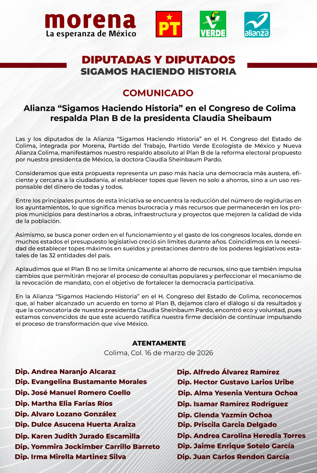 Las y los diputados de la Alianza “Sigamos Haciendo Historia” en el H. Congreso del Estado de Colima, integrada por Morena, Partido del Trabajo, Partido Verde Ecologista de México y Nueva Alianza Colima, manifestamos nuestro respaldo absoluto al Plan B de la reforma electoral propuesto por nuestra presidenta de México, la doctora Claudia Sheinbaum Pardo.