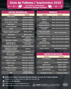 La amplia oferta incluye disciplinas como danza contemporánea, ballet clásico, danza área, yoga, ritmos latinos, k-pop, danzas urbanas, teatro, piano, batería, canto, violín, guitarra clásica, contemporánea y eléctrica, joyería y bisutería, modelado en barro y pintura estilo rangeliano, entre muchas otras opciones. Todos estos talleres serán impartidos por maestros y maestras de trayectoria reconocida en el estado.