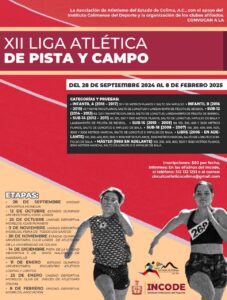 La Liga Atlética de Pista y Campo 2024, será la décimo-segunda edición y tendrá nueve etapas, iniciando en la Unidad Deportiva ‘Morelos’ este 28 de septiembre, además del 26 de octubre, 9 de noviembre, 25 de enero y 8 de febrero; en el Estadio Olímpico Universitario el 12 de octubre, 30 de noviembre y 11 de enero; y en la Unidad Deportiva ‘5 de Mayo’ de Manzanillo el 14 de diciembre.