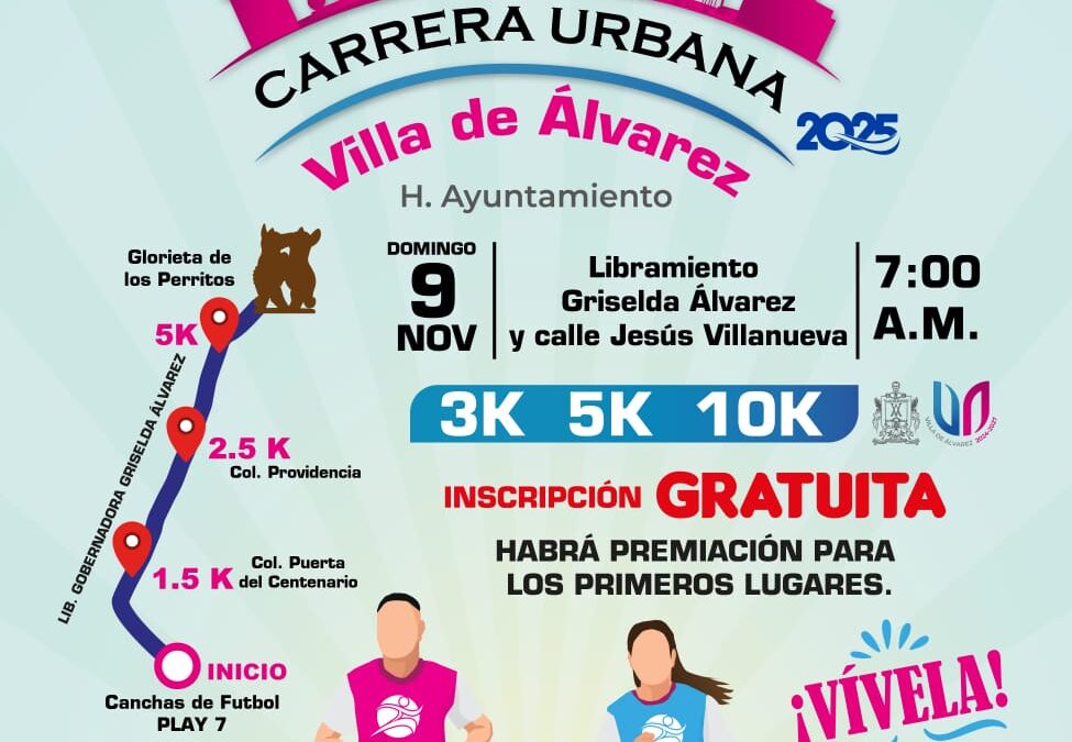Sergio Dolores Villalvazo, Director de Deportes de Villa de Álvarez, indicó que la Carrera Urbana Villa de Álvarez 2025, la cual forma parte del programa Invasión Deportiva, iniciará a las 7:00 de la mañana en las cancha de Play 7, concluyendo en ese mismo lugar, luego de llegar a la Glorieta de Los Perritos.
