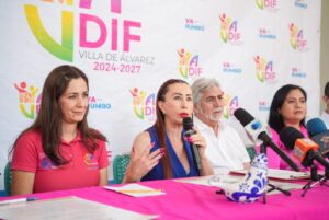 En la conferencia prensa acompañaron a la Presidenta Tey Gutiérrez, Petronilo Vázquez, Director del Instituto de Festejos Charro Taurino y Exposiciones de Villa de Álvarez, Cristina Árcega, Directora del Registro Civil de Villa de Álvarez, y Martha Yaditra Martínez, Directora del DIF Municipal Villa de Álvarez.