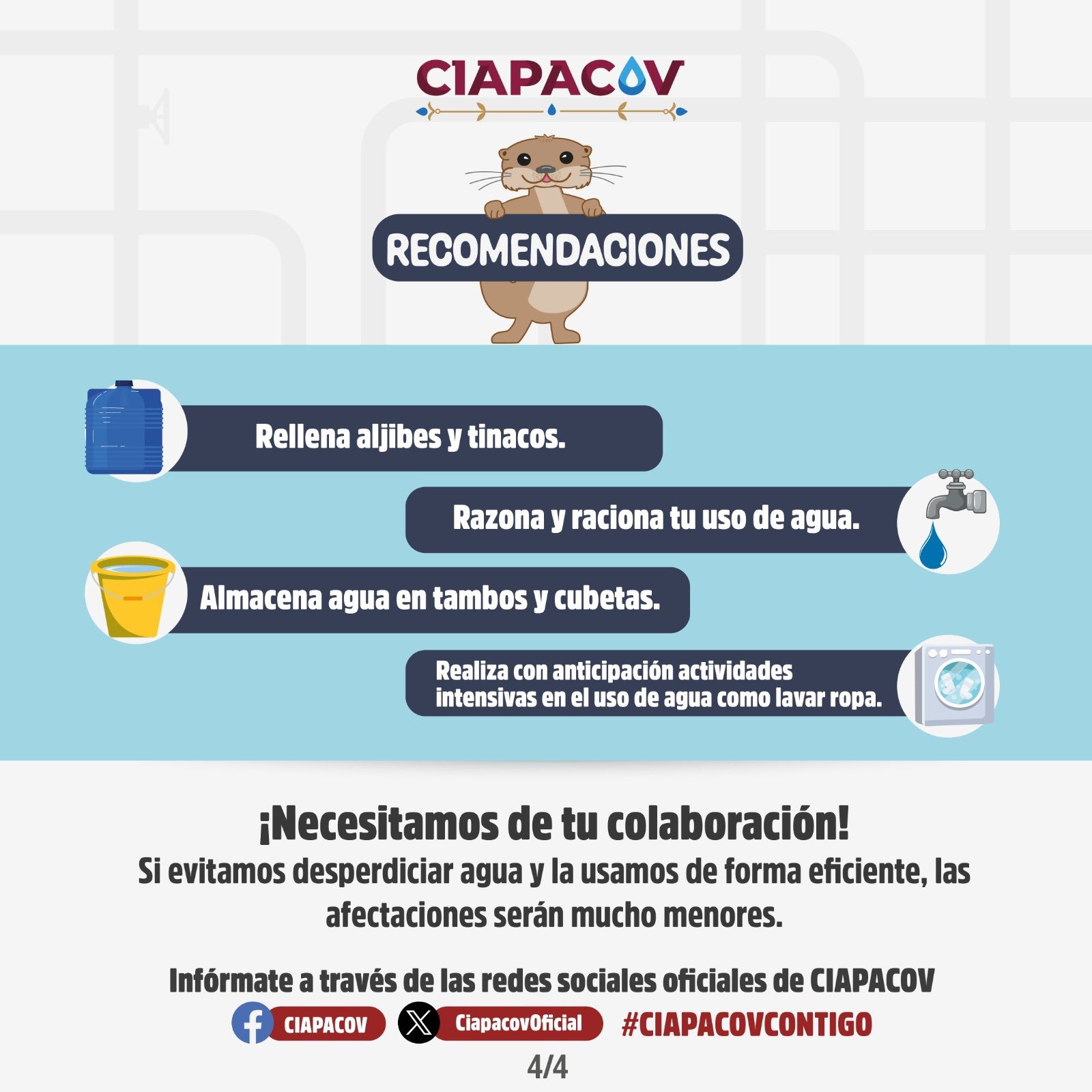 CIAPACOV hace un llamado a las y los usuarios de las colonias enlistadas a racionar y hacer un uso responsable del agua durante este periodo, siguiendo estas recomendaciones: