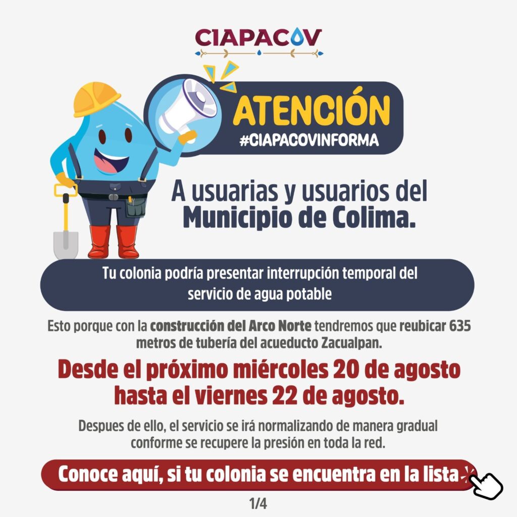 Se reubicarán 700 metros de tubería del acueducto Zacualpan, lo que ocasionará interrupciones temporales en el suministro de agua potable en diversas colonias del municipio de Colima.