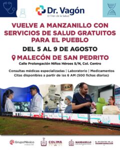 Este martes, la presidenta municipal de Manzanillo, Rosa María Bayardo Cabrera, participó en los “Diálogos por la Transformación” de la gobernadora Indira Vizcaíno Silva donde anunciaron que el “Dr. Vagón, El Tren de la Salud” estará en Manzanillo del 5 al 9 de agosto en el malecón de San Pedrito, en la zona Centro.