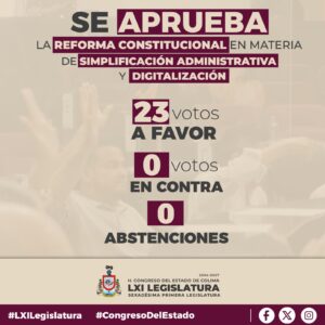 En sesión extraordinaria, el pleno de la LXI Legislatura del Congreso del Estado de Colima, aprobó por unanimidad el dictamen que reforma los Artículos 25 y 73 de la Constitución Federal en materia de simplificación administrativa y digitalización.