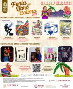 La Subsecretaría de Cultura del Gobierno del Estado de Colima inaugurará este jueves la ‘Feria del Libro Colima 2024’ con actividades gratuitas para toda la familia que se desarrollarán del 3 al 6 de octubre en el Museo Palacio de Gobierno de Colima y el Teatro Hidalgo, donde el público colimense podrá disfrutar conciertos, talleres y espectáculos literarios con artistas de distintos estados del país. Además, 25 autores presentarán sus más recientes libros.