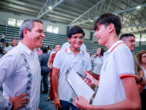 “Ustedes viven en un tiempo distinto, con oportunidades que antes no existían. Además de las becas, en el gobierno estatal hemos entregado computadoras a estudiantes de secundaria para que les duren durante la preparatoria. Todo esto es posible gracias a la confianza que la gobernadora ha puesto en la juventud y al compromiso con su educación”, expresó.