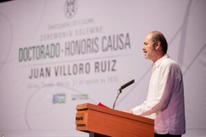 La gobernadora Indira Vizcaíno Silva acudió este miércoles como invitada de honor por la Universidad de Colima a la entrega del Doctorado Honoris Causa al escritor Juan Villoro Ruiz, ceremonia efectuada en el Teatro Universitario ‘Coronel Pedro Torres Ortiz’; ahí, en presencia del rector Christian Jorge Torres Ortiz Zermeño, la mandataria estatal indicó que en términos políticos se tienen muchas coincidencias con el literato.