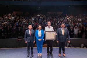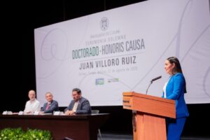 La titular del Poder Ejecutivo estatal felicitó a Juan Villoro por este doctorado que reconoce su trayectoria; «sé que los escritores escriben por una necesidad ineludible de expresar, de sacar ideas de su cerebro y emociones de su pecho, y que esa es una necesidad muy personal; pero su escritura, estimado Juan, presta un gran servicio a nuestra sociedad. Así que ojalá que este reconocimiento influya en que usted continúe con esta vocación que tan bien desempeña».