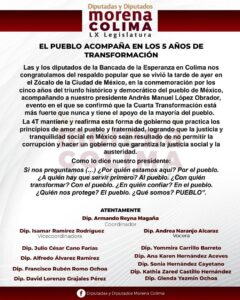 A través de un comunicado publicado en sus plataformas digitales, las y los diputados de Morena en Colima, coordinados por el legislador tecomense Armando Reyna Magaña, reafirmaron que en la Bancada de la Esperanza se congratulan “del respaldo popular que se vivió la tarde de ayer en el Zócalo de la Ciudad de México, en la conmemoración por los cinco años del triunfo histórico democrático del pueblo de México, acompañando a nuestro presidente Andrés Manuel López Obrador, evento en el que se confirmó que la Cuarta Transformación está más fuerte que nunca y tiene el apoyo de la mayoría del pueblo”.