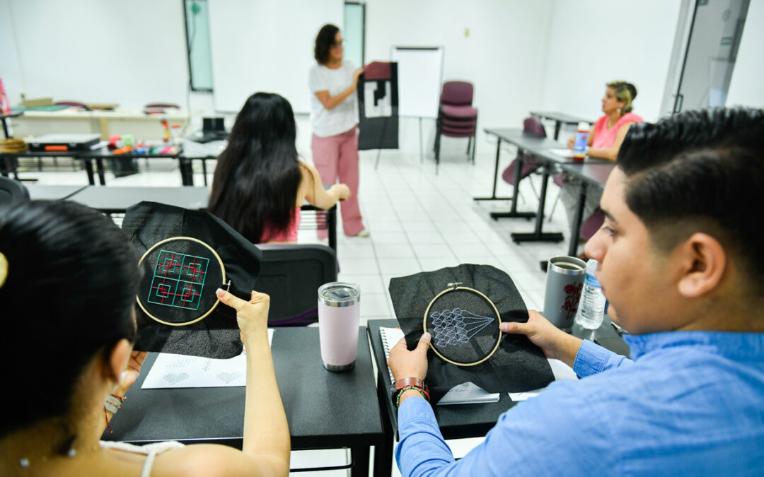 La artista visual y profesora de la Escuela de Artes Visuales del Instituto Universitario de Bellas Artes (IUBA) de la Universidad de Colima, Nayeli Fernández Degante, durante el curso “Aproximaciones a las prácticas artísticas no convencionales”, dijo que bordar patrones con hilo de colores sobre tela podría sistematizar el pensamiento a través del orden, la simetría, geometría, el contar y planear