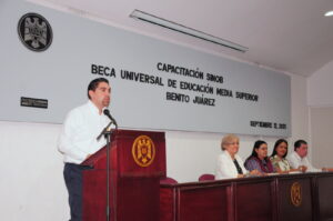 Este fin de semana la Universidad de Colima, en coordinación con la oficina estatal de la Coordinación Nacional de Becas para el Bienestar Benito Juárez, llevó a cabo una jornada de capacitación dirigida a 35 directores y 38 encargados del área de becas del nivel medio superior. El objetivo fue fortalecer sus conocimientos sobre el Sistema Integral para la Operación de Becas Benito Juárez. La actividad tuvo lugar en el auditorio de la Facultad de Ciencias de la Educación.