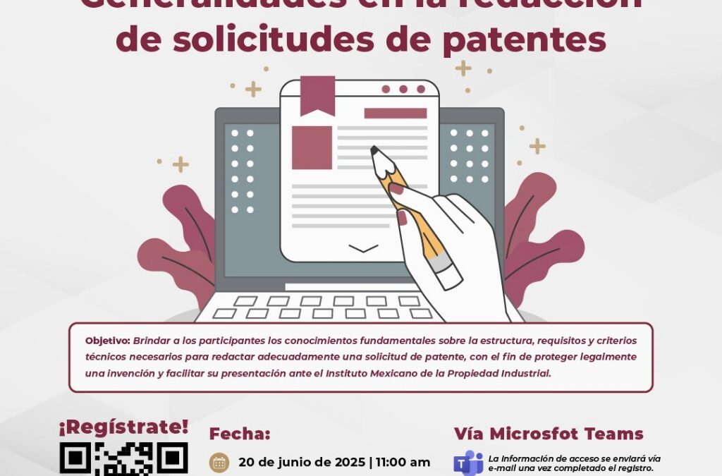 La sesión titulada ‘Generalidades en la redacción de solicitudes de patentes’ se llevará a cabo este 20 de junio por la mañana vía Microsoft Teams. El objetivo es brindar herramientas clave para proteger legalmente las diferentes invenciones, mediante una correcta redacción de solicitudes de patente. El registro sigue abierto en https://forms.gle/29GTeP57LszhGBTm7