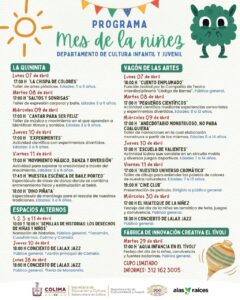 La Subsecretaría de Cultura del Gobierno del Estado de Colima, a través del Departamento de Cultura Infantil y Juvenil, comparte la programación completa del Mes de la Niñez, cartelera de actividades artísticas para celebrar el Día del Niño y de la Niña con talleres gratuitos de artes y ciencias, conciertos, jornadas de lectura, funciones de cine y tardes de juego e integración.