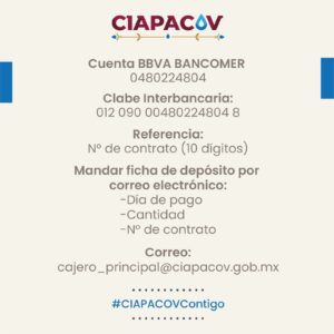 La usuaria y usuario deberán escribir en la referencia de la transferencia el número de contrato de CIAPACOV (10 dígitos) para después enviar la ficha de depósito por correo electrónico con los siguientes datos al correo, cajero_principal@ciapacov.gob.mx:
