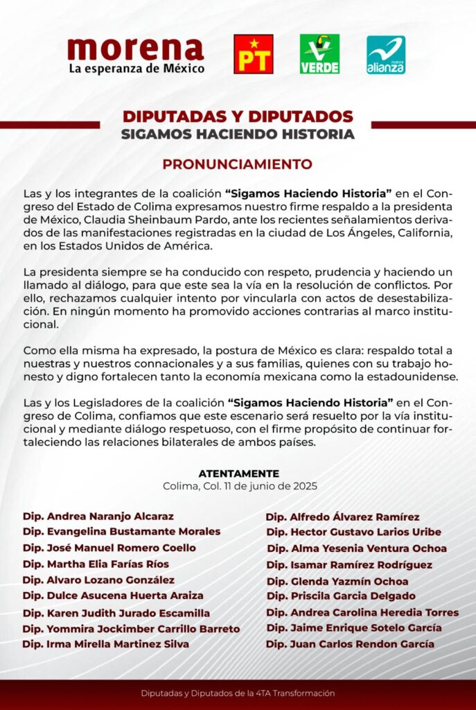 Las y los integrantes de la coalición “Sigamos Haciendo Historia” en el Congreso del Estado de Colima expresamos nuestro firme respaldo a la presidenta de México, Claudia Sheinbaum Pardo, ante los recientes señalamientos derivados de las manifestaciones registradas en la ciudad de Los Ángeles, California, en los Estados Unidos de América.