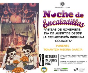 El martes 28, se realizará la “Noche de Encaladillas”, con la conferencia “Visitas de noviembre: Día de Muertos desde la cosmovisión indígena colimota”, a cargo de la investigadora Tonantzin Medina García, quien reflexionará sobre los significados rituales y simbólicos de esta festividad en las comunidades originarias de Colima.