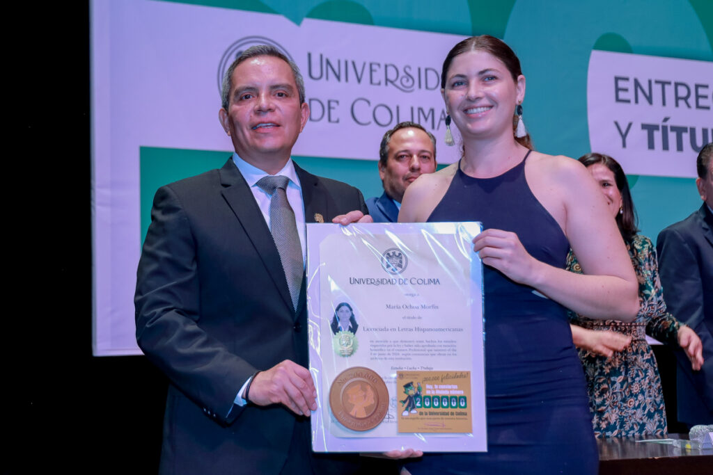 A 85 años de su fundación, añadió, la Universidad de Colima ha formado a las y los profesionales que impulsan el desarrollo estatal, por lo que llamó a las y los nuevos titulados a sentirse orgullosos de haber culminado una etapa de formación en la máxima casa de estudios del estado. “Sabemos que el entorno presenta desafíos importantes, pero este documento que hoy reciben los faculta para encontrar mejores oportunidades o para generar las propias”, concluyó.