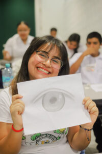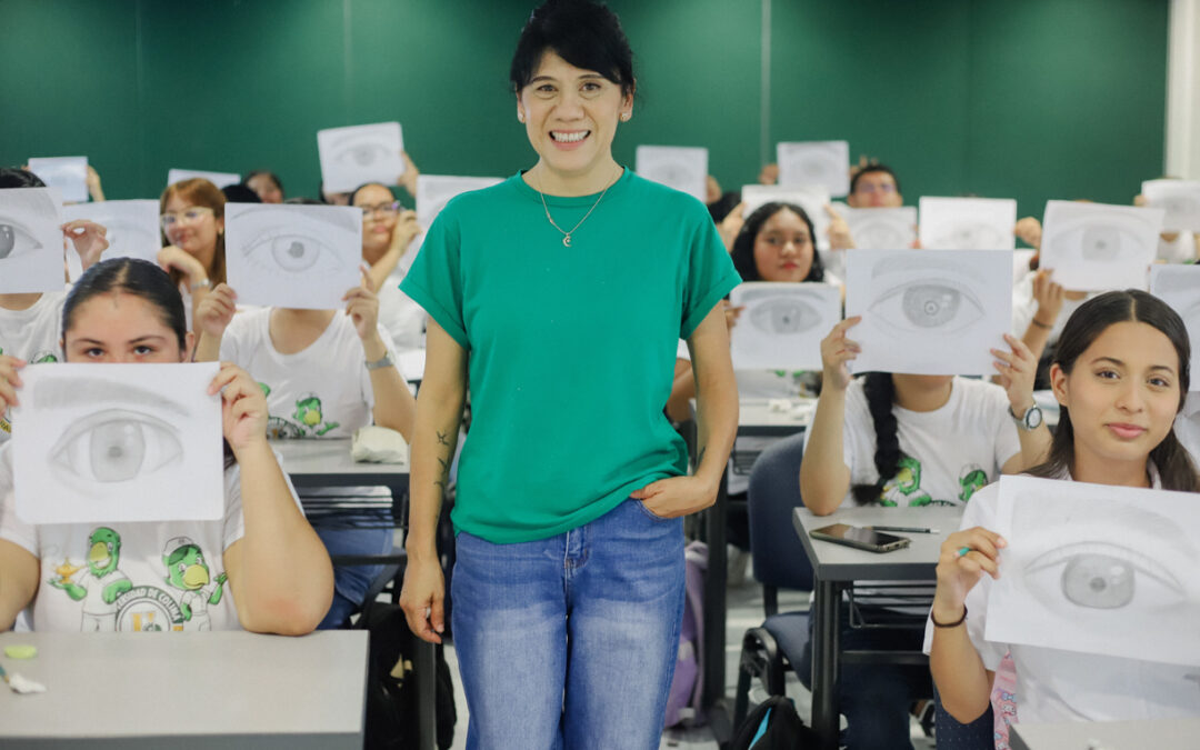 La tercera fue el taller “Práctica de dibujo: retrato”, a cargo de la artista visual Sandra Uribe, quien ofreció una introducción a las técnicas básicas del dibujo y a la expresión creativa. Las y los estudiantes realizaron un retrato de un ojo humano, enfocándose en detalles como iris, sombras, pestañas y líneas esenciales, para lograr un resultado expresivo y realista.