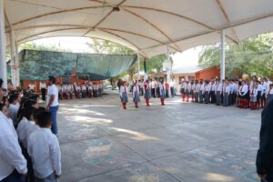 Las diputadas Karen Jurado, Martha Farias, Dulce Huerta, Cristina Lupién, Betzaida Pinzón, Evangelina Bustamante, y el diputado Israel González, participaron en los honores a la bandera, la lectura de efemérides más importantes de la semana, representación artística y reconocimiento a maestras y maestros del plantel educativo.
