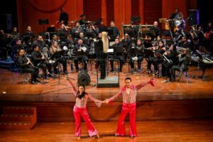 Bajo la dirección de Perla Cortés Castillo, la Banda Sinfónica del Gobierno del Estado de Colima interpretó temas como Love is in the air, Stayin Alive y popurrís con los grandes hits de Abba y Queen.