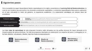 Habló también de Learning Hub en Semiconductores, una plataforma en línea del EmTech Institute (Instituto en Tecnologías Emergentes), que concentra contenidos de formación en diseño y en pruebas, ensamble y empaquetado (ATP). Dicha plataforma permite que los y las docentes repliquen el conocimiento con sus estudiantes. Como parte de esta estrategia, compartió Yadira Álvarez, a los docentes que tomaron el “Programa de Formación de Formadores” se les otorgará una beca, a ellos y también a sus estudiantes.