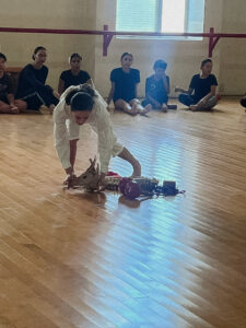 A partir de ahí, el salón se transformó en laboratorio. Los ejercicios no partieron de pasos establecidos, sino de sensaciones y premisas corporales. “Partimos del cuerpo animal, de usar las manos en el suelo, de cambiar la mirada, de imaginar que vemos con otros ojos”, explicó Michelle. “No es aprender una coreografía, sino explorar cómo el cuerpo puede transformarse”.