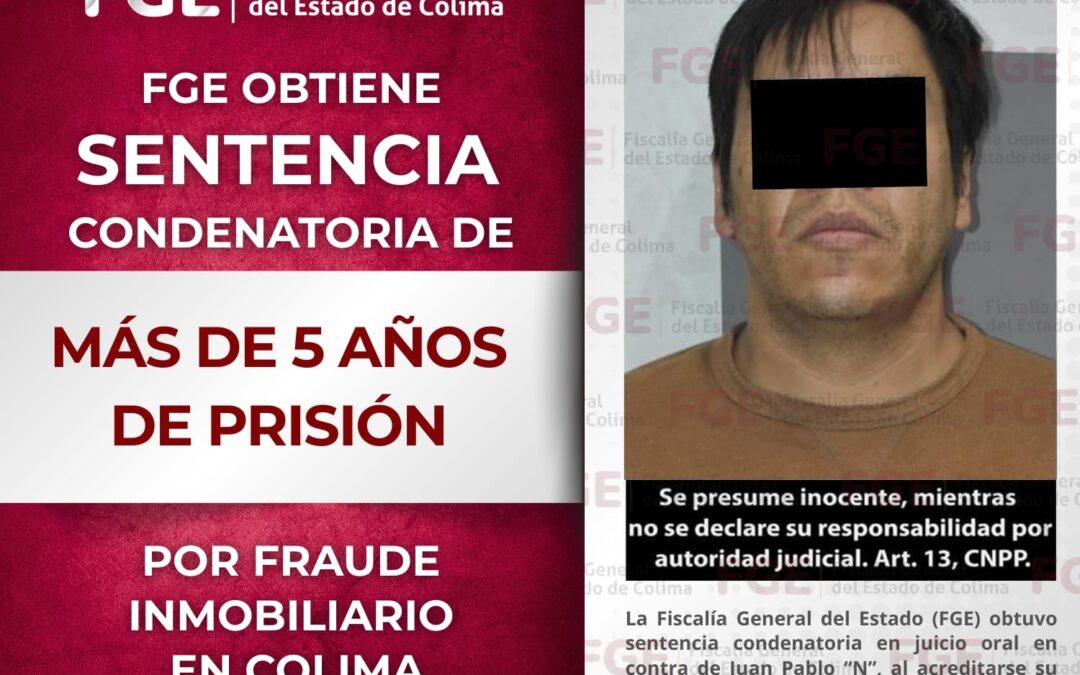 La Fiscalía General del Estado (FGE) obtuvo sentencia condenatoria en juicio oral en contra de Juan Pablo “N”, al acreditarse su responsabilidad en el delito de fraude, cometido en la ciudad de Colima.