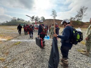 Por la tarde, cuatro elementos especializados del grupo de Búsqueda y Rescate Colima fueron trasladados en helicóptero hacia la comunidad de Chapula, donde colaboran en la localización de cinco personas reportadas como desaparecidas, tras el colapso de varias viviendas.