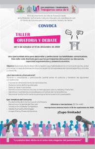 Villa de Álvarez, Col.- La Presidenta Tey Gutiérrez Andrade presentó la convocatoria al Taller Oratoria y Debate, que se realizará en Villa de Álvarez todos los sábados desde el 4 de octubre y hasta el 13 de diciembre y en el que podrá participar la población en general.