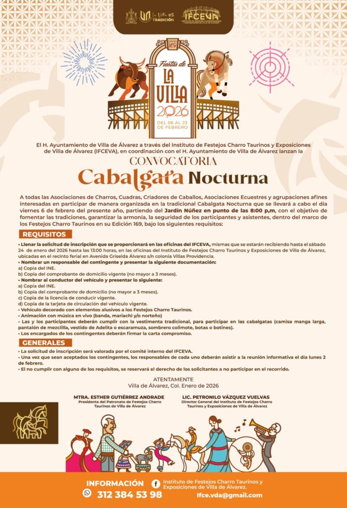 Villa de Álvarez, Col.- La Presidenta Municipal Tey Gutiérrez Andrade y el Director del Instituto de Festejos Charro Taurinos y Exposiciones de Villa de Álvarez (IFCEVA), Petronilo Vázquez Vuelvas, dieron a conocer la convocatoria de la Cabalgata Nocturna, la cual se realizará el viernes 6 de febrero a partir de las 8:00 de la noche, la cual partirá del Jardín Núñez en el municipio de Colima.