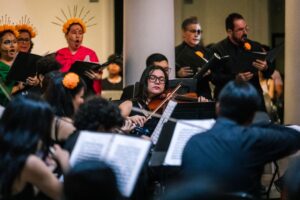 Sobre esta presentación, que contó con la participación de 25 integrantes del Coro y 28 músicos de la Orquesta Sinfónica, el compositor, músico y arreglista universitario José Antonio Frausto Zamora comentó que busca celebrar, desde la música, estas fechas de día de muertos con canto, música y poesía. “Para nosotros, la música y el sonido son reflejo de esa conexión con las personas que ya no se encuentran entre nosotros y han partido a otro plano, pero es también una celebración de la vida”.