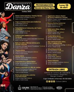 La Subsecretaría de Cultura del Gobierno del Estado de Colima celebrará el Día Internacional de la Danza los días 28 y 29 de abril con el Maratón de Master Class en Casa de la Cultura Estatal y un Carrusel Escénico, que contará con la participación de agrupaciones dancísticas de toda la entidad, de distintas expresiones y disciplinas de la danza clásica y moderna.