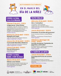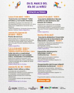 La Subsecretaría de Cultura del Gobierno del Estado de Colima, en coordinación con el programa ‘Alas y Raíces’ de la Secretaría de Cultura del Gobierno de México, celebrarán el Mes de la Niñez con más de quince eventos artísticos, entre conciertos, obras de teatros, jornadas de lectura y talleres artísticos, que se llevarán a cabo del 13 al 30 de abril.