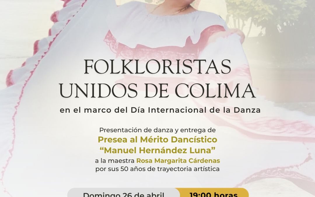 La Subsecretaría de Cultura del Gobierno del Estado de Colima invita a la función especial que ofrecerá la agrupación Folkloristas Unidos en el Teatro Hidalgo el domingo 26 de abril, con la que esta asociación fundada por Manuel Hernández Luna celebra sus primeros diez años de trayectoria trabajando por el rescate, preservación y difusión de expresiones y saberes dancísticos distintivos de la entidad.
