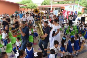 Bajo la dirección de Perla Cortés Castillo, la agrupación estatal compartió con las y los pequeños estudiantes un recorrido a través de todos los instrumentos que conforman una banda sinfónica, permitiéndoles conocer sus nombres, sonido y forma en se interpretan; les ofrecieron un alegre repertorio que puso a reír, cantar, aplaudir y bailar al alumnado y plantilla docente en una mañana inolvidable de música e integración.