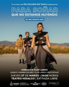 La Subsecretaría de Cultura del Gobierno del Estado de Colima y la compañía Pathos Teatro, celebrarán el Día Mundial del Teatro invitando a la población interesada a una función gratuita de la obra ‘Para soñar que no estamos huyendo’ en el Teatro Hidalgo el jueves 27 de marzo a las 8:00 de la noche. La entrada es libre y la obra es recomendada para adolescentes y adultos.