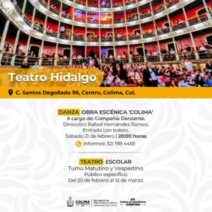 En la amplia oferta de actividades destaca la cartelera del Teatro Hidalgo con el nuevo programa de teatro escolar que ofrecerá del 20 de febrero al 12 de marzo, funciones gratuitas para estudiantes de nivel básico de toda la entidad, en horarios matutinos y vespertinos. Además, el sábado 21 a las 8:00 de la noche, la Compañía Danzante presentará su obra ‘Colima’, una propuesta dancística bajo la dirección de Rafael Hernández Ramos.
