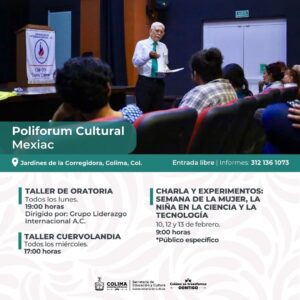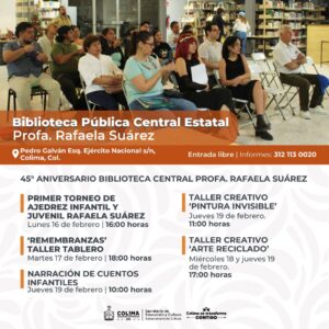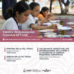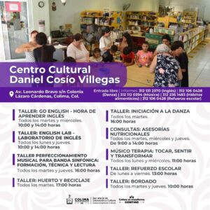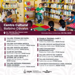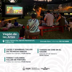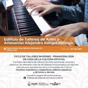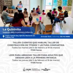 Siguen los talleres gratuitos de lunes a sábado en el Centro Cultural ‘Julia Piza Miranda’ de Manzanillo; el Vagón de las Artes y La Quininita (espacios para las infancias en la Casa de la Cultura Estatal), el Centro Cultural ‘Balbino Dávalos’, la Biblioteca Pública Central ‘Rafaela Suárez’ y el Centro de Cultura Escrita ‘Miguel Ángel Cuervo’. La agenda cultural completa puede consultarse en las redes sociales: Cultura Colima en Facebook y cultura.colima en Instagram.