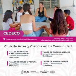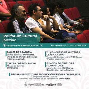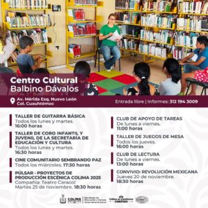 La Subsecretaría de Cultura del Gobierno del Estado de Colima publica su agenda del mes de noviembre, en la que se ofertan más de 40 eventos artístico-culturales, entre talleres gratuitos, funciones de cine, tertulias literarias, encuentros de hip-hop y guitarra clásica, que tendrán lugar en los distintos recintos públicos de la entidad.