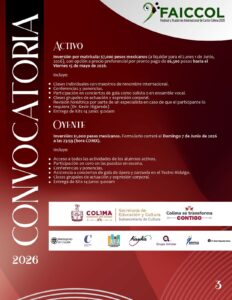 Los requisitos para registro, las bases completas de la convocatoria, así como la plantilla docente, está en las redes oficiales de la Subsecretaría de Cultura y del Comité Organizador del FAICCOL. La fecha límite de envío de audiciones para participantes activos es el 27 de abril, mientras que las personas interesadas en integrarse como oyentes tienen hasta el 7 de junio para llenar el formulario.