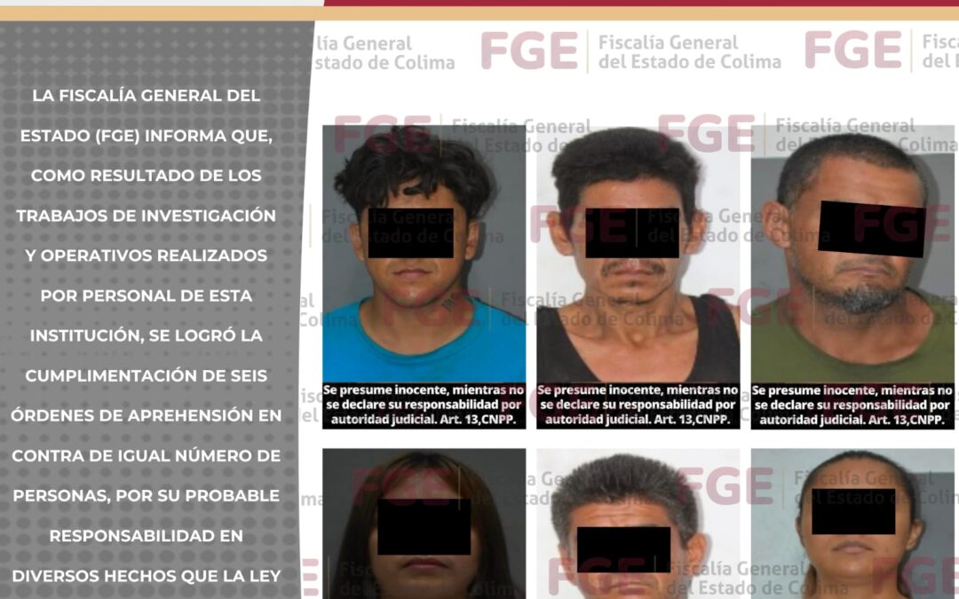 La Fiscalía General del Estado (FGE) informa que, como resultado de los trabajos de investigación y operativos realizados por personal de esta institución, se logró la cumplimentación de seis órdenes de aprehensión en contra de igual número de personas, por su probable responsabilidad en diversos hechos que la ley establece como delitos, en el periodo que comprende del 02 al 08 de marzo de este año.