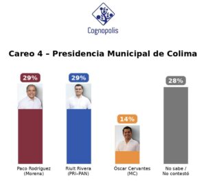 La casa encuestadora Cognopolis presentó resultados de su consulta de enero de la intensión del voto para la Presidencia Municipal de Colima en el 2027, donde Morena destacó como la opción más fuerte en las distintas posibilidades de perfiles que resultaron del estudio realizado.